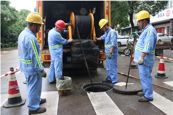 6月15日,在箬横镇横滨大道广场路段,工作人员对该路段的雨、污管道系统进行检测、清淤,筑牢防汛安全网。