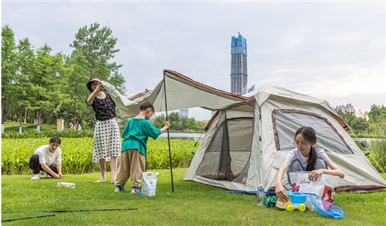 近日,九龙汇公园绿地上“长”出了不少五颜六色的帐篷、天幕,露营爱好者们或全家总动员,或约上三五好友,在湖畔“安营扎寨”,享受着与大自然亲密接触的闲适时光。