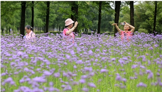 6月26日,许多来自上海的游客在市区九龙汇公园观赏马鞭草。