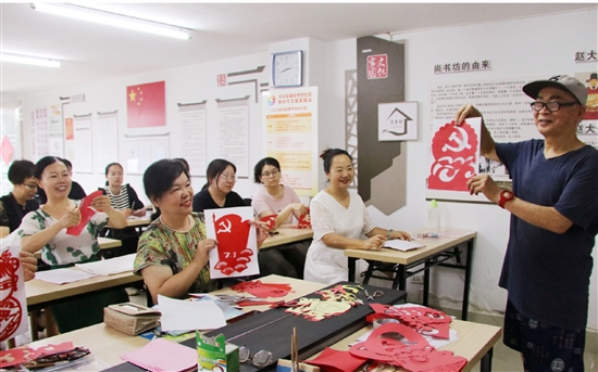6月25日,在太平街道尚书坊社区新时代文明实践站,温岭市剪纸艺人林荣文向社区居民教授如何剪党徽。