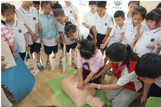 近日,九龙小学神童门校区一(5)班、二(3)班的学生们来到市疾病预防控制中心,学习健康安全和应急救护知识。图为学生们在现场老师的指导下,学习心肺复苏技能。