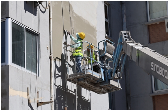 连日来,各地进入高温炙烤模式,但是广大户外工作者却仍脚踏热浪,迎战“烤”验,在烈日下坚守岗位。图为太平街道老旧小区改造施工现场,工人“全副武装”,头顶烈日赶工期。