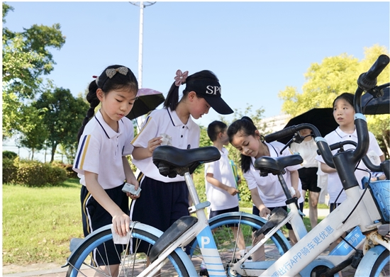 近日,九龙小学二(3)中队的同学们充分发扬奉献、友爱、互助、进步的志愿者精神,开展了以“单车不孤单,文明润心田”为主题的社会实践活动。在家长的带领下,同学们分组前往学校周边、地铁口、商场等场所,用稚嫩的双手给单车“洗澡”,送单车“归家”,为单车“杀菌”,用实际行动倡导大家争做文明骑行的守护者,共同助力文明城市创建。 通讯员 王浩 摄