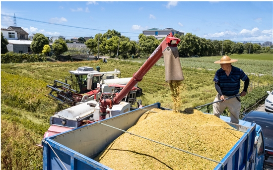 7月22日,在箬横镇红升村,种粮大户正调派3辆联合收割机对200余亩早稻进行抢收。今年第3号台风“格美”临近,为防止台风可能带来的不利影响,确保夏粮颗粒归仓,连日来,温岭各地种粮大户纷纷行动起来,相关烘干房、粮库也抓紧烘干、加班收储,切实守住群众的“米”袋子。