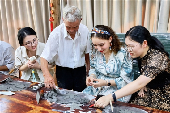国际友谊日到来之际,7月29日,“邂逅美丽乡村——2024年温岭市欧美同学会、温岭市留联会、台州学院海外留学生同心修学”活动在坞根镇举行。活动涉及农耕体验、民俗交流、灰雕制作、草坪水枪大战、超级排球友谊赛等内容,让学生们从国际角度看温岭乡村美景,感悟中国传统文化,促进中外交流。图为学生们在体验灰雕制作。 记者 童锦伟 通讯员 张微莹 程霄旦 摄