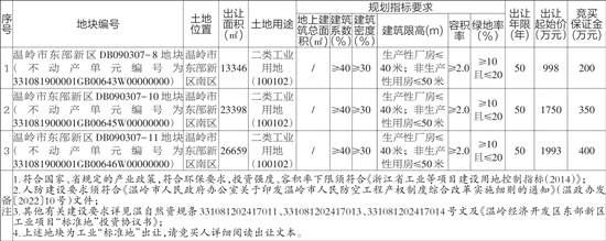 根据国家有关法律、法规规定,依据温自然资规条331081202417011、331081202417013、331081202417014号建设用地规划条件,经温岭市人民政府批准,温岭市自然资源和规划局决定以挂牌方式出让温岭市东部新区三块工业用地(工业“标准地”)的国有建设用地使用权,现将有关事项公告如下: