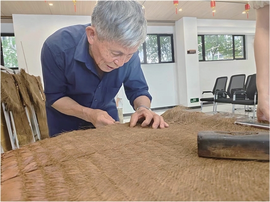 王度宗就是这样用一根比筷子略小的蓑衣针,一盒用桐油浸过、用来润滑引针的棕线,左手扒针右手挑针,编织好一件可遮风挡雨的蓑衣,为我们再现古人“青箬笠,绿蓑衣,斜风细雨不须归”的浪漫。