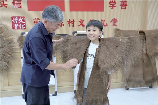 横峰街道“莞蔡蓑衣”就是传统的上衣下裳样式。从1955年开始制作蓑衣,当地手艺人王度宗师傅至今还在跟蓑衣打交道。
