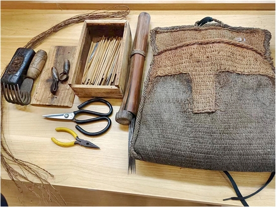 从左往右依次为棕线、菜油罐子、钉耙、指套、剪刀、老虎钳、竹签、夹子、蓑衣针、工具包。