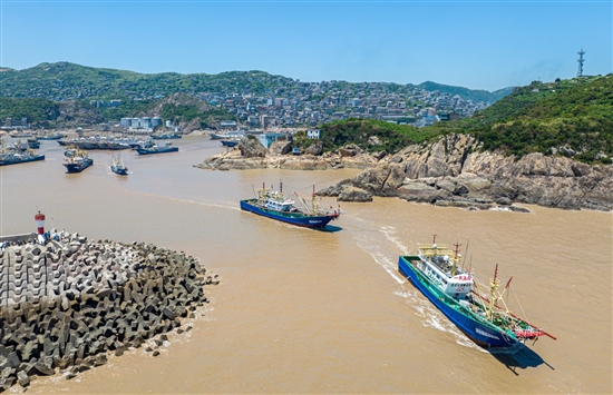 8月1日,石塘镇钓浜渔港,首批解禁的渔船开足马力,向东海进发。