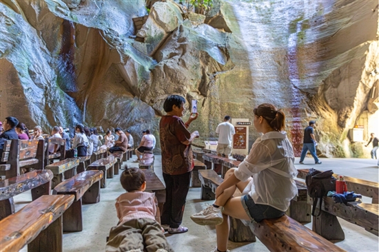 连日来,受高温影响,山林、水上项目备受欢迎。因硐内温度只有18℃,新河镇长屿硐天景区内1314个形态各异的硐窟,成为市民游客避暑乘凉的乐园。图为近日游客正在观夕硐景区休闲避暑。 记者 徐伟杰 通讯员 宋悦 摄