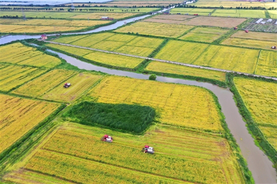 8月5日,松门镇乃崦村种粮大户赵明来的早稻田里,来自安徽省六安市的收割机跨区作业队正在收割早稻,助力早稻及时收割,确保稻谷颗粒归仓。