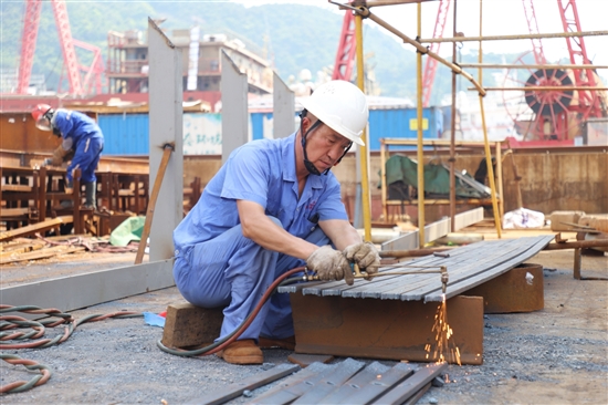 8月7日上午,位于松门镇白岩村的浙江天时造船有限公司船坞内,工人们正冒着高温建造一艘5万载重吨的油化船。企业工作人员介绍,该船从今年3月份开造,预计2025年2月出坞,是该企业今年生产的第三艘出口船舶。