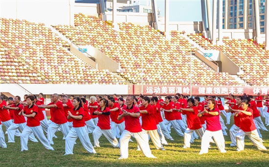 8月8日是我国第16个全民健身日。当天上午,在市体育中心田径场,市武术协会会员正在进行八段锦、24式太极拳表演。