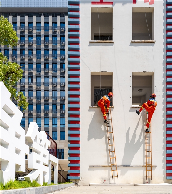 消防员在开展云梯训练。