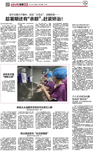 记者从市妇保院了解到,暑期,儿童康复科特别推出三大主题课程,包括行为管理注意力训练课程,构音障碍训练课程,青少年脊柱侧弯、体态矫正训练课程。趁暑假还有“余额”,家长们赶紧带孩子行动起来吧。
