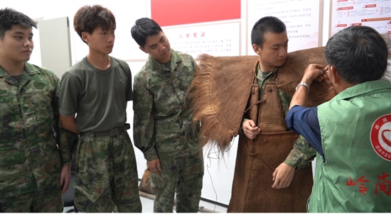 老兵王度宗拿出自己珍藏的蓑衣,向即将入伍的新兵们仔细介绍。这个对于新兵来说的新奇物件,是战争年代的宝贵财富。从蓑衣的制作,再到蓑衣在抗战过程中发挥的重要作用,听完老兵的讲解,新兵们感悟颇深,纷纷体验穿蓑衣,感受曾经的抗战岁月。