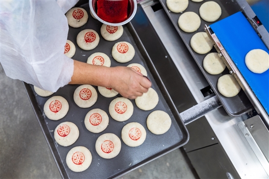 工人给刚做好的月饼盖上传统的红印。