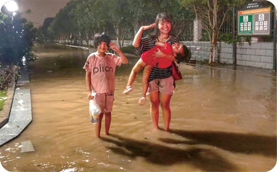 2019年10月,台风夜,在太平街道三星桥,温岭市蓝天救援队队员开车送母女三人回家。下车后,母女俩向救援队队员敬礼致谢。