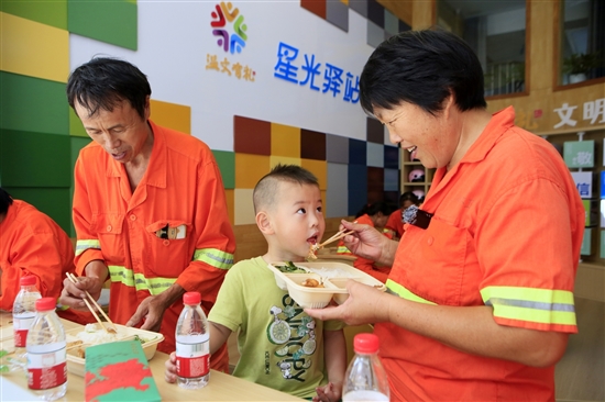 近日,三星小学“星光驿站”内,环卫工人们正在享用免费午餐、月饼和矿泉水。