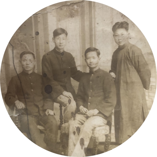 照片虽已破损,上半部分几乎全部断裂,画面上也有斑迹,但合影的四人形象依然清楚。据陈乃华介绍,其中右边那位就是继父陈琴朋,这是家里留下的唯一一张陈琴朋的照片。照片为竖幅拍摄,背景中有窗等,前景四个合影者里,左边的三个都是坐着的,右边的陈琴朋则穿长衫站立着。