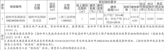 根据国家有关法律、法规规定,依据温自然资规条331081202417021号建设用地规划条件及温岭市DB240206地块建设条件须知,经温岭市人民政府批准,温岭市自然资源和规划局决定以挂牌方式出让温岭市东部新区DB240206地块(工业“标准地”)的国有建设用地使用权(不动产单元编号为331081106062GB01218W00000000),现将有关事项公告如下: