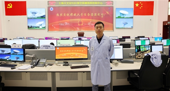 6月25日,嫦娥六号返回器顺利降落着陆场后,陈中在VLBI中心拍照留念。