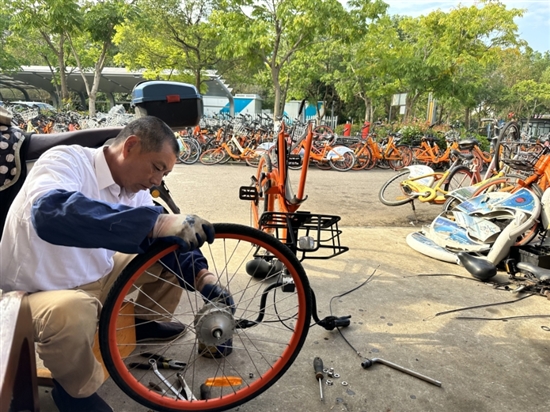 “这辆车前刹车片坏了,需要拆下来更换。”维修师傅郑玲华修了近40年的自行车,修起车来非常娴熟。花了几十分钟,他顺利将刹车片换好,试骑没问题后,将车子停在了固定的区域。