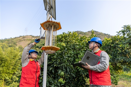 得知农户的情况后,2019年7月,国网温岭市供电公司箬横供电所利用树与树之间的有效空间,免费为菊香家庭农场安装了100多块太阳能光伏板,光伏板下连接杀虫灯,对害虫进行诱杀的同时,兼备照明的功能。“将农业生产和光伏发电结合起来,农户防虫、灭虫不受电源的限制,既减少了电缆铺设和维护的成本,也减少了农药的使用量和次数,提高了土地利用率,达到农业种植受益和能源发电效益的双赢。”箬横供电所相关负责人告诉记者,菊香家庭农场的光伏发电板全年可发电4万多度,为农户减少用电成本2万多元。
