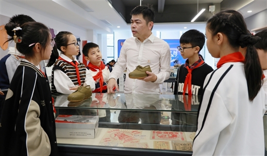 展览馆负责人颜凌波向同学们介绍解放鞋。