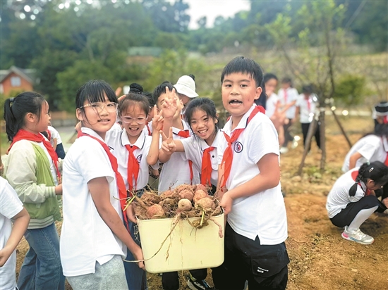 秋色旖旎,硕果飘香,温中实验学校的实践基地喜获丰收。10月21日至23日,温中实验学校小学部的同学们扛着锄头、带上箩筐,上山秋收了!摘毛豆、挖番薯,小伙伴们体验了劳动之美,畅享了收获之乐,感受了劳动之幸福! 通讯员 王美燕 摄