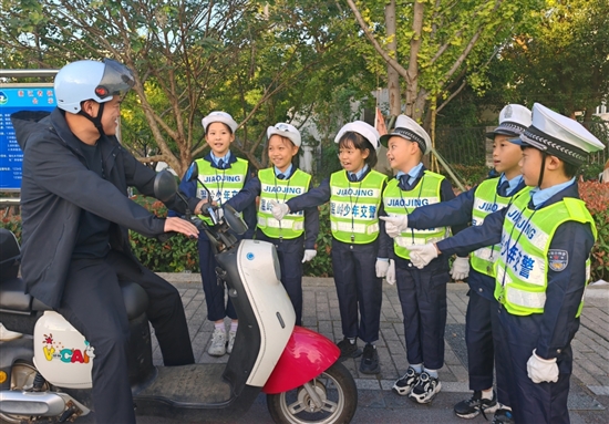本报讯(记者郑灵芝文/图)“头盔一戴,安全常在。”近日,市交警大队城区二中队联合城西小学,创新性地开展了一场“小小交警执勤”宣传教育活动。当天下午,6名来自城西小学的小交警站在学校门口,对未佩戴安全头盔的市民进行了别开生面的童趣“喊话式”安全劝导。