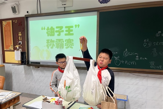 采摘前,学生们自主查阅资料,了解红心柚、柿子的生长环境和营养成分。听劳动老师讲解安全要领、采摘方法后,学生们纷纷行动起来。树下,学生们有的踮起脚尖采摘,有的利用工具协作采摘,有的清点果实的个数。他们欢快忙碌的身影穿梭在树木之间,收获的喜悦写满每一张笑脸。结束后,学生们围在一起给柚子“量腰围”“称体重”,赛出班级的“柚子王”。