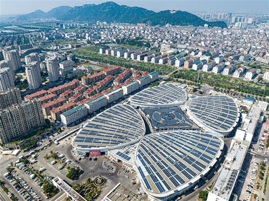 近日,位于松门水产品批发市场屋顶的光伏板在太阳光照射下熠熠生辉,贝壳型的屋顶光伏电站引人注目,形成一道独特的风景线。