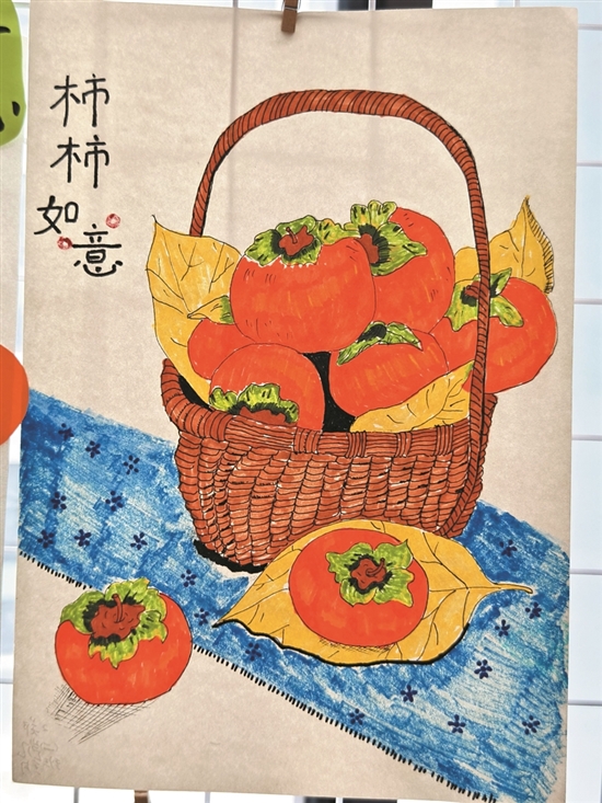 “柿子如同小灯笼,鲜艳的橙色在阳光下闪烁,透着一抹温暖的光辉。”“悬挂在枝头的柿子,犹如秋天的宝石,点缀着金黄的树叶,构成了一幅生动的秋日画卷。”文字下的柿子栩栩如生,画笔下的柿子更是惟妙惟肖。同学们根据生活中的见识,发挥想象力,创作出有关柿子的优美画作,并赋予美好的寓意,共同渲染这份秋日的温馨色彩。
