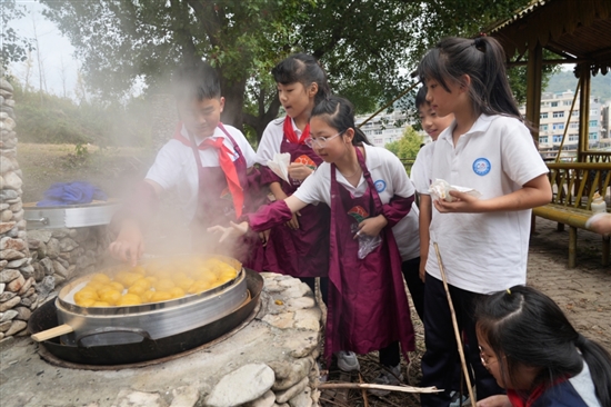另一边,同学们忙着拾柴、生火,准备制作温岭传统美食——番薯藤炒米面、番薯圆。将猪肉煸出香味,再放入虾干,倒入番薯藤和米面进行翻炒,一道美食很快制作完成。“好吃!”学生们拿着筷子,争相品尝自己的劳动成果。