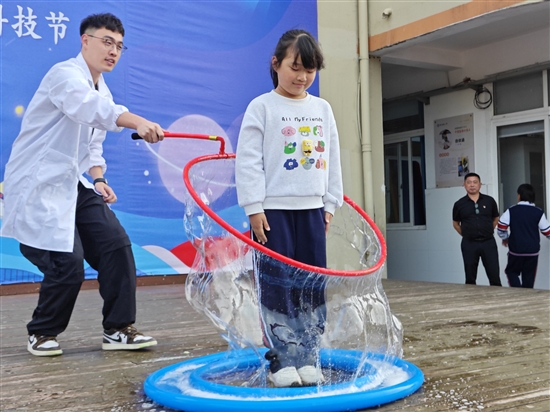 从一个小小的泡泡,到可以容纳一个1.7米高学生的大泡泡,学生和老师们实验了多次。“我们一开始是将泡泡水放在小脸盆里,然后挪到一个大桶里,其间需要不断地调整水和肥皂液的比例。”带队老师郭瑜梦说,这就是探索的魅力,通过自己不断的努力,最后收获成功。在这个过程中,学生们不仅看到了科技的神奇,也感受到创新的力量。