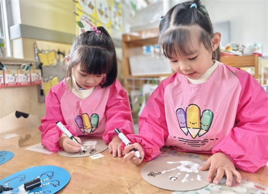 小朋友们创作雪人画。