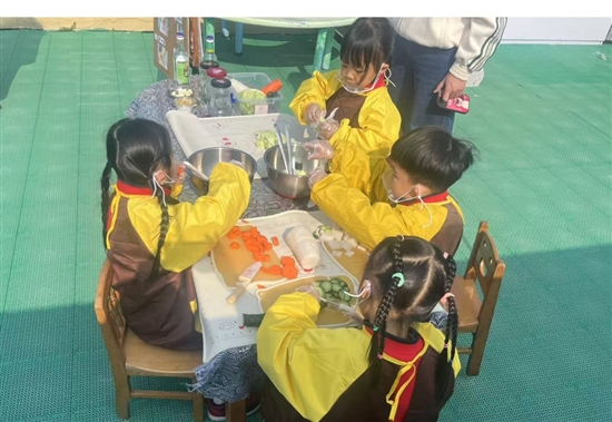 中国有句谚语:“小雪腌菜,大雪腌肉。”“小雪”后,家家户户开始腌制、风干各种蔬果,以备过冬食用。因此,孩子们将亲手种的白萝卜进行清洗、切块,再调味腌制,最后密封入罐。在腌制萝卜的过程中,小朋友们收获了满满的成就感。