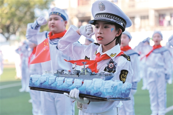 “海军潜艇部队”“海军岸舰导弹部队”等六个方阵的队员们身着统一的海军服,步伐矫健,动作标准,意气风发地行进着,直到检阅台前停下,每一个身姿都站如青松。“稍息、立正、跨立、齐步走……”小海军们在教官的指令下,从简单的稍息立正到复杂的四面转向,每一个动作都充满力量。