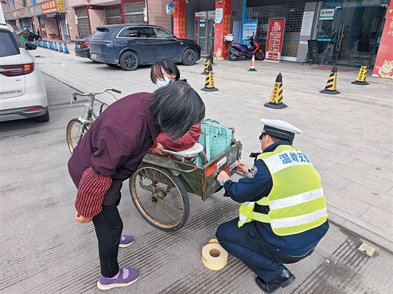 日前,坞根交警值勤室组织警力在辖区红军路及坞根菜场周边开展“亮尾行动”。民辅警为无反光标识、反光标识不清晰的二三轮电动车、人力三轮车等粘贴反光条,确保反光标识齐全有效,让“车尾”亮起来,让安全“看得见”。同时,民辅警还提醒驾驶人要牢记交通安全法律法规,遵章守法出行。