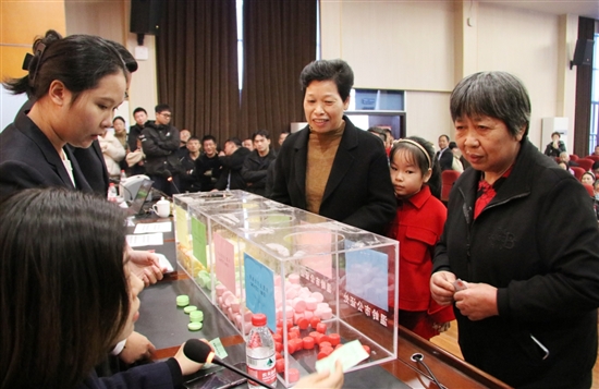 10时30分,房号抽签正式开始。岙底胡村村民彭女士是首批上台抽签的村民。此前,她就和家人一起去村里新建的安置公寓看过。“小区环境很不错,配套设施也很齐全。我这次抽到的房子在11楼,很满意。”彭女士高兴地说。