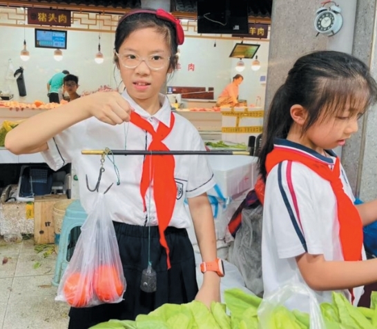 木杆秤制作完成后,小组成员们带着自己做的杆秤来到温岭第一菜场,准备摆摊当小老板。