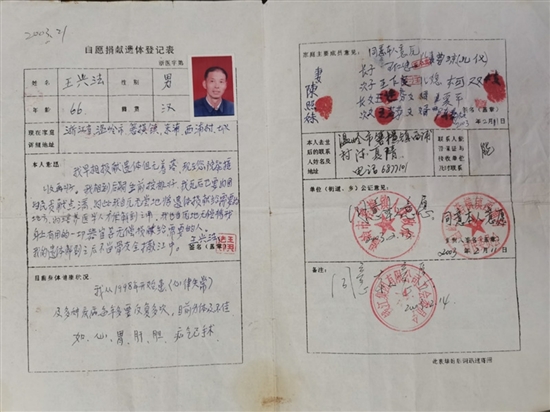 “父亲把全家人都召集起来,表达了自己捐献遗体的强烈意愿。”王仁良清楚地记得,这是王家第一次召开家庭会议,他的意愿终于得到了全家人的支持。登记表上,妻子、儿女、媳妇、女婿都签字按了手印,但王兴法还是不放心,让村委会、箬横镇和钱江摩托集团有限公司都盖了章。