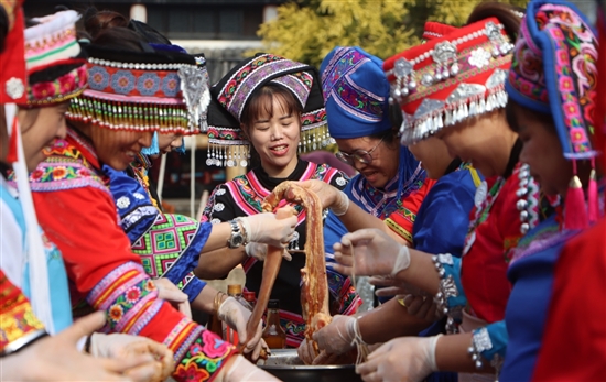 在现场,除了腌制五花肉外,各族媳妇们还串起了肉肠。看着一整排的腌肉,大家馋意四起。韦美连是土家族人,她的娘家在广西,已经远嫁到温岭有20多年了。“嫁到这边这么多年,还是头一次亲手做娘家的美食,特别是和这么多姐妹一起做,仿佛自己又回到了娘家一样,太热闹,太有幸福感了。”她高兴地说。