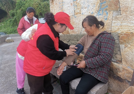 志愿者为海岛老人量血压。
