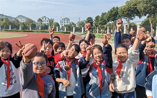 日前,松门四小迎来了一年一度的“小小农夫体验日”。在学校的劳动教育实践基地里,孩子们有的挥舞着小铲子小心翼翼地挖掘着,有的蹲在地上用手轻轻拨开泥土寻找目标,还有的直接上手去拉扯红薯露出地面的部分。每当有人成功挖出一个番薯,周围总会响起阵阵掌声与欢呼声。经过一个多小时的努力奋斗,每个孩子手中都捧着战利品。这些新鲜出土的番薯不仅是对学生辛勤付出最好的回报,也将成为家庭与学校之间的情感纽带。
