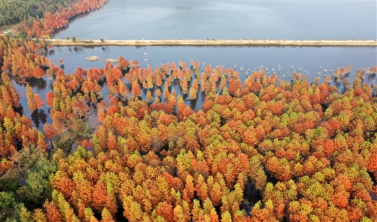 眼下,在大溪镇太湖水库,成千上万棵生长在水中的落羽杉换上了“红妆”,与清澈的湖水交相辉映,构成一幅美不胜收的冬日画卷,吸引众多游客前来观赏。