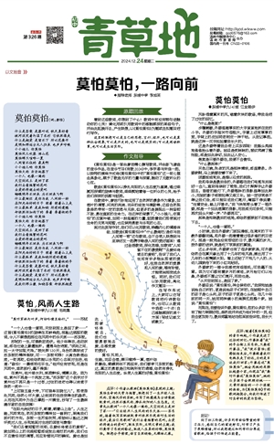 点评:小作者从歌曲《莫怕莫怕》表现的主题:莫怕生命的无常与短暂,联想到了一生历经人生风雨、宦海沉浮的苏轼,书写了他遭遇乌台诗案被贬黄州,仍然不惧风雨、挣扎向阳的人生态度。文章先从歌词“一个人也像一滴雨,天空到泥土是回了家……”引出经历人生风雨的乐天派——苏东坡,接着叙写苏轼被贬黄州依然乐观面对生活的经历,最后引用歌词“我们去看短暂的花吧,去爱终将逝去的爱吧”,联系实际,点明文章的主题:我们要学习东坡的豁达,纵使人生真的好难,莫怕莫怕。联想合乎情理,语言自然晓畅,无雕琢之痕。