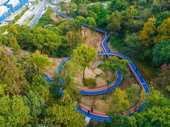本报讯(记者姚天 通讯员郭玲 陈榕/文 记者徐伟杰/图)“这条‘空中跑道’脚感特别好,踩上去软软的,不伤膝盖。跑道高低起伏,同时不用担心车辆,跑起来就是享受。”这几天,家住城西街道云樾观岭小区的许女士都会到家门口的碗头山公园晨跑。